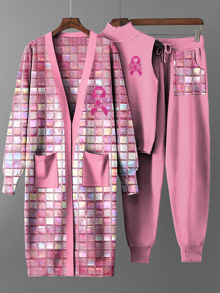 Frauen Vintage Brustkrebs band Langer Mantel Stricken Dreiteiler Set