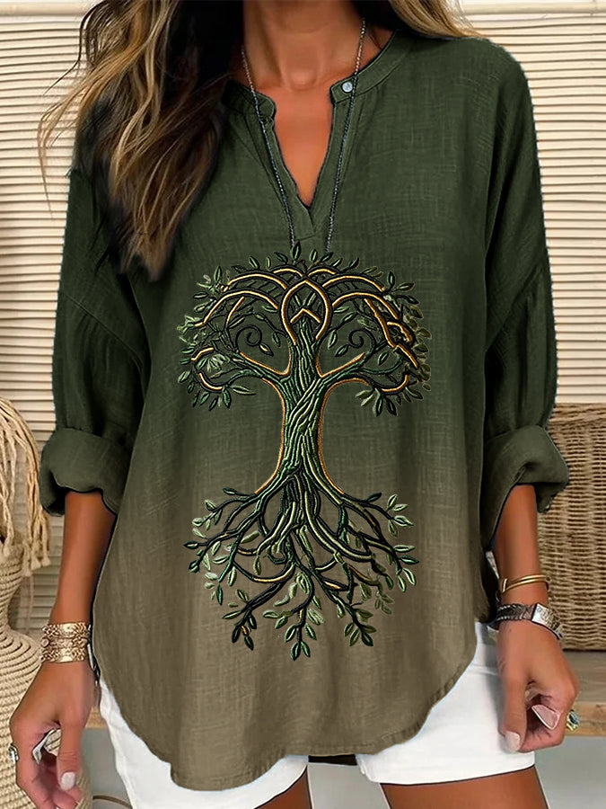 Frauen Wikinger Leben von Baum Kunst Leinen Print Freizeit hemd