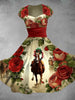 Kentucky Derby Pferd Kunst bedruckt Vintage V-Ausschnitt Falten Taille Kurzarm Midi-Kleid