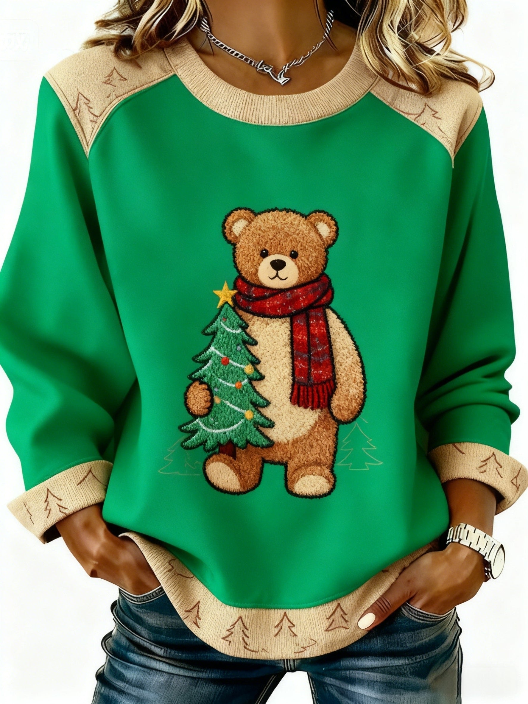 Retro Weihnachten niedlich Bär Weihnachts baum Patchwork Design gedruckt lässig Lose Langarm Sweatshirt